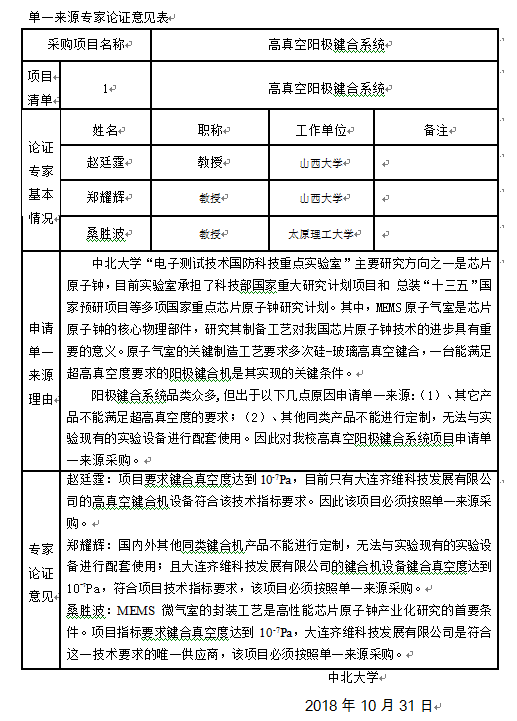 阳极键合系统品类众多,但出于以下几点原因申请单一来源:(1)、其它产品不能满足超高真空度的要求;(2)、其他同类产品不能进行定制,无法与实验现有的实验设备进行配套使用。因此对我校高真空阳极键合系统项目申请单一来源采购。