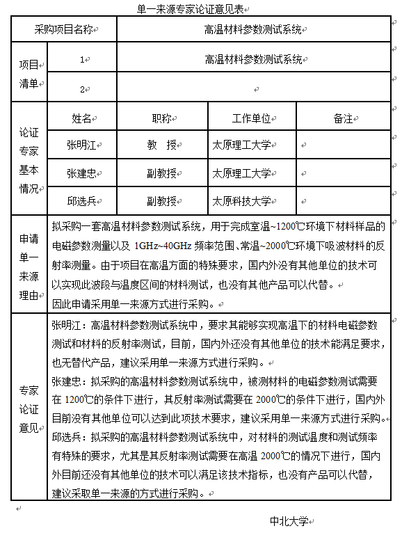我校承担的高温测试系统-微波材料参数及反射率测试系统研制项目中,拟采购一套高温材料参数测试系统,系统包括高温材料参数测试与高温反射率测试两部分。高温材料参数测试用于完成室温~1200℃环境下被测样品的电磁参数测量,分别研建X波段(8.2GHz~12.4GHz)高温材料电磁参数测试子系统和Ku波段(12.4GHz~18GHz)高温材料电磁参数测试子系统。需要的测试频率范围在8.2GHz~12.4GHz,测试温度范围在室温~1200℃。高温反射率测试用于测试1GHz~40GHz频率范围、常温~2000℃环境下测量吸波材料的反射率。由于项目在高温方面的特殊要求,国内外没有其他单位的技术可以实现此波段与温度区间的材料测试,也没有其他产品可以代替,只能采用单一来源方式进行采购。