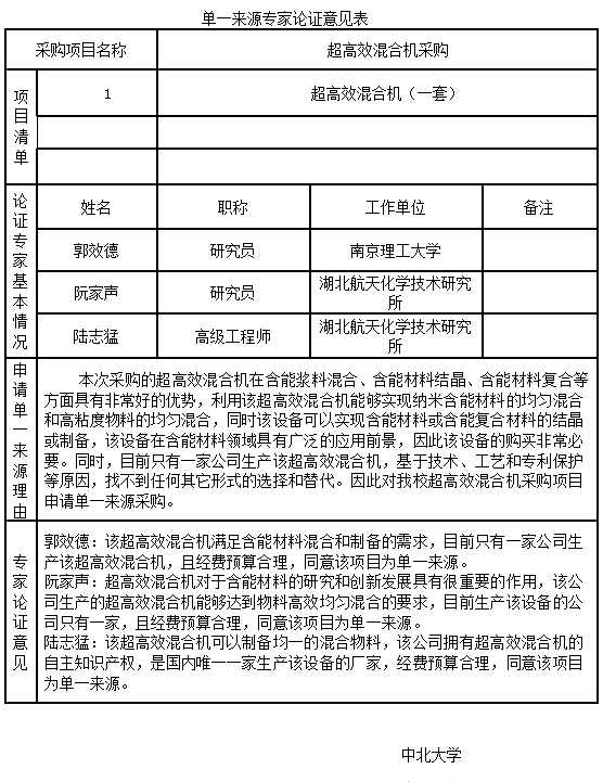本次采购的超高效混合机在含能浆料混合、含能材料结晶、含能材料复合等方面具有非常好的优势,利用该超高效混合机能够实现纳米含能材料的均匀混合和高粘度物料的均匀混合,同时该设备可以实现含能材料或含能复合材料的结晶或制备,该设备在含能材料领域具有广泛的应用前景,因此该设备的购买非常必要。同时,目前只有一家公司生产该超高效混合机,基于技术、工艺和专利保护等原因,找不到任何其它形式的选择和替代。