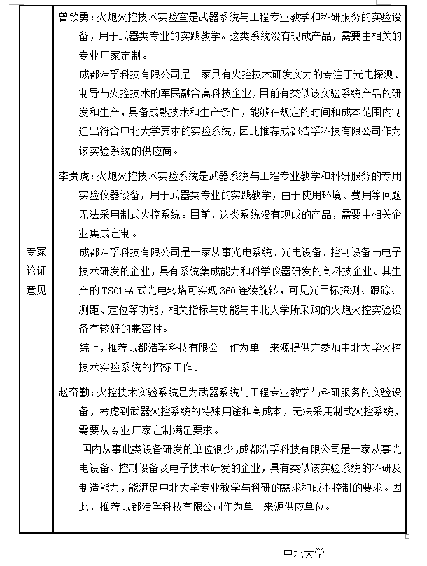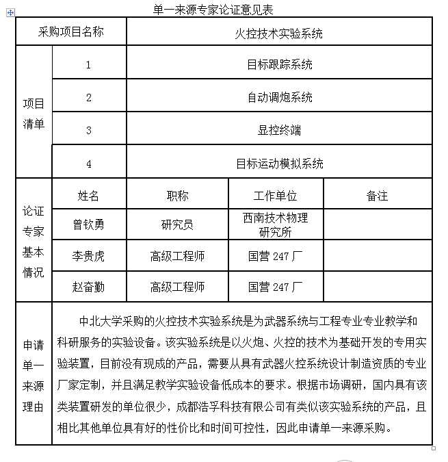 火炮武器的火控系统是武器技术中的高新技术,且具有很强的专业性和行业特点。中北大学采购的火控技术实验系统是为武器系统与工程专业教学和科研服务的实验设备。该实验系统是以火炮、火控技术为基础开发的专用实验装置,目前没有现成的产品,需要从具有武器火控系统研制能力的专业厂家定制,并且满足教学实验设备低成本的要求。根据专业教学和科研的需要,该试验设备拟以火炮火控的技术为基础进行开发。成都浩孚科技有限公司是一家具有光电探测、制导与火控技术研发实力的军民融合高新技术企业,现有的科研和生产产品与此实验系统要求相似,能够提供性价比好的实验系统、满足该实验室建设项目的要求,因此申请本采购项目采用单一来源方式采购。