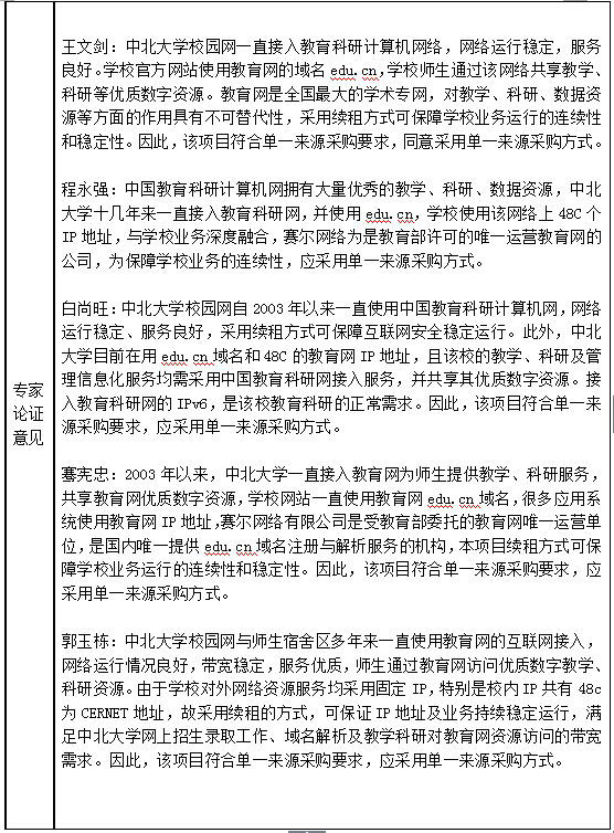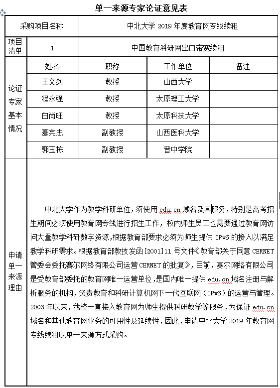 中北大学作为教学科研单位,须使用edu.cn域名及其服务,特别是高考招生期间必须使用教育网专线进行招生工作,校内师生员工也需要通过教育网访问大量教学科研数字资源,根据教育部要求必须为师生提供IPv6的接入以满足教学科研需求。根据教育部教技发函[2001]11号文件《教育部关于同意CERNET管委会委托赛尔网络有限公司运营CERNET的批复》,目前,赛尔网络有限公司是受教育部委托的教育网唯一运营单位,是国内唯一提供edu.cn域名注册与解析服务的机构,负责教育和科研计算机网下一代互联网(IPv6)的运营与管理。2003年以来,我校一直接入教育网为师生提供科研教学等服务,为保证edu.cn域名和其他教育网业务的可用性及延续性,因此,申请中北大学2019年教育网专线续租项目以单一来源方式采购。