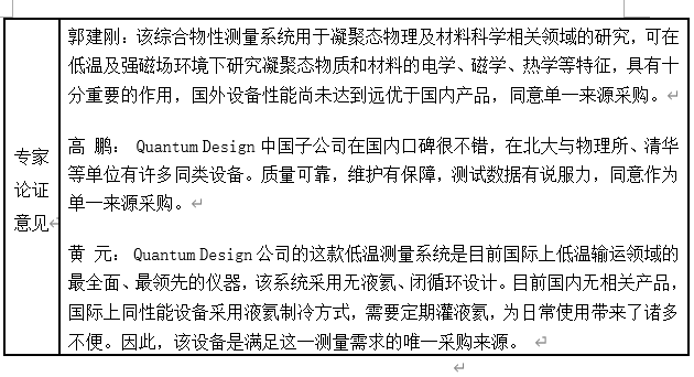 申请采购的设备需要满足研究所需的物性测量精度、温度和磁场的精确控制,目前国内没有满足测量要求的设备生产厂家。经过调研考察选定美国Quantum Design公司开发的一款无液氦综合物性测量系统,该设备是目前物理性能测试仪器中最为全面、典型的一款设备。该设备可以在极低温和强磁场平台上进行全自动的磁学、电学等多种物性测量,后期还可升级热学和光电、光磁等拓展功能。该系统在物性测试方面,是非常权威和具有代表性的测试设备。综合物性测量系统性能稳定,质量可靠,后续维护可操作性强。其中系统所使用的流阻精确控温等多项核心技术只能由该厂商提供,因此具有生产厂家唯一性。