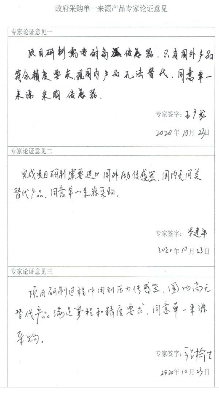 压力传感器是压力测试系统补充科研项目中的关重部件,应用于特殊恶劣环境的测量,国内产品的精度、量程、动态特性、体积等指标无法满足该项目要求;目前该类型传感器只有瑞士奇石乐公司能够生产,型号为6215BAQ01,奇石乐中国有限公司为注册于香港的瑞士奇石乐公司在中国的全资子公司,陕西福瑞进出口有限责任公司是奇石乐中国有限公司授权本项目的唯一代理商;因此,拟申请单一来源方式采购。