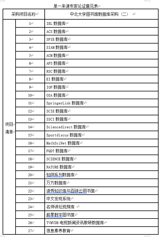 中北大学就中北大学图书馆数据库采购 (二) 项目申请单一来源方式采购,该项目预算金额8630000元,分为32个数据库项目,拟采购数据库产品及成交供应商见附表。