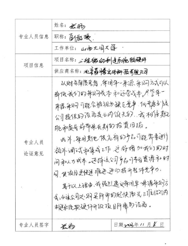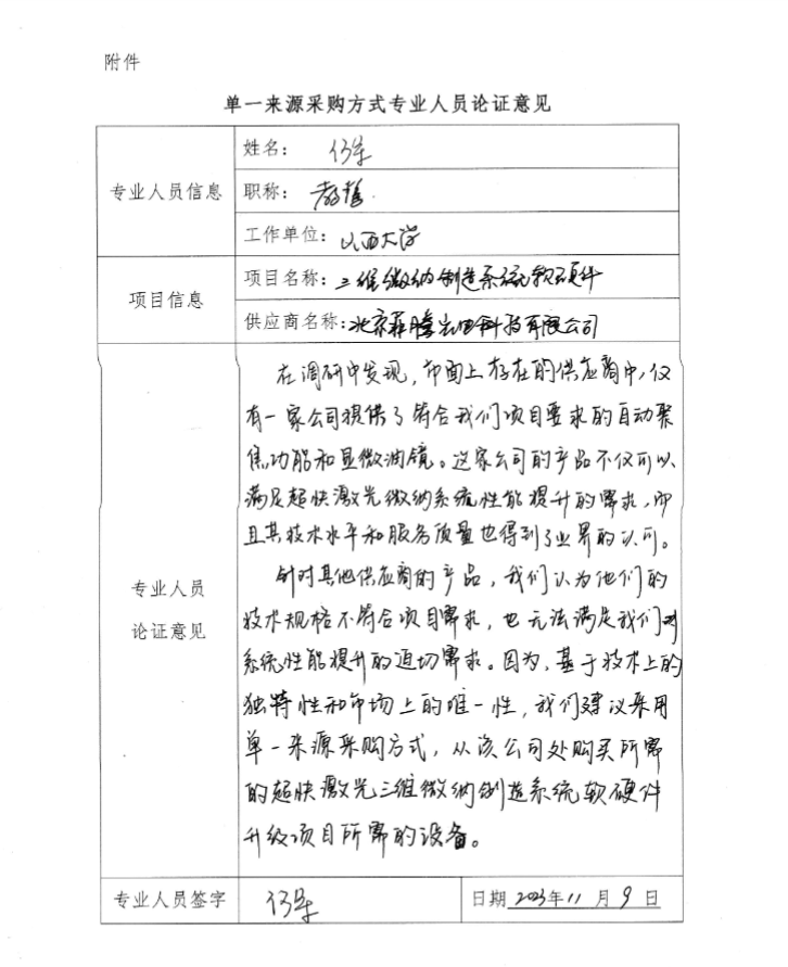 考虑到该项目技术、服务的专业性,为了确保该系统的质量、服务和技术支持的安全可靠,根据《中华人民共和国政府采购法》第三十一条之规定,“只能从唯一供应商处采购的”,建议采用单一来方式实现对本项目的采购”。因此对我校“三维微纳制造系统软硬件”采购项目申请单一来源采购。
